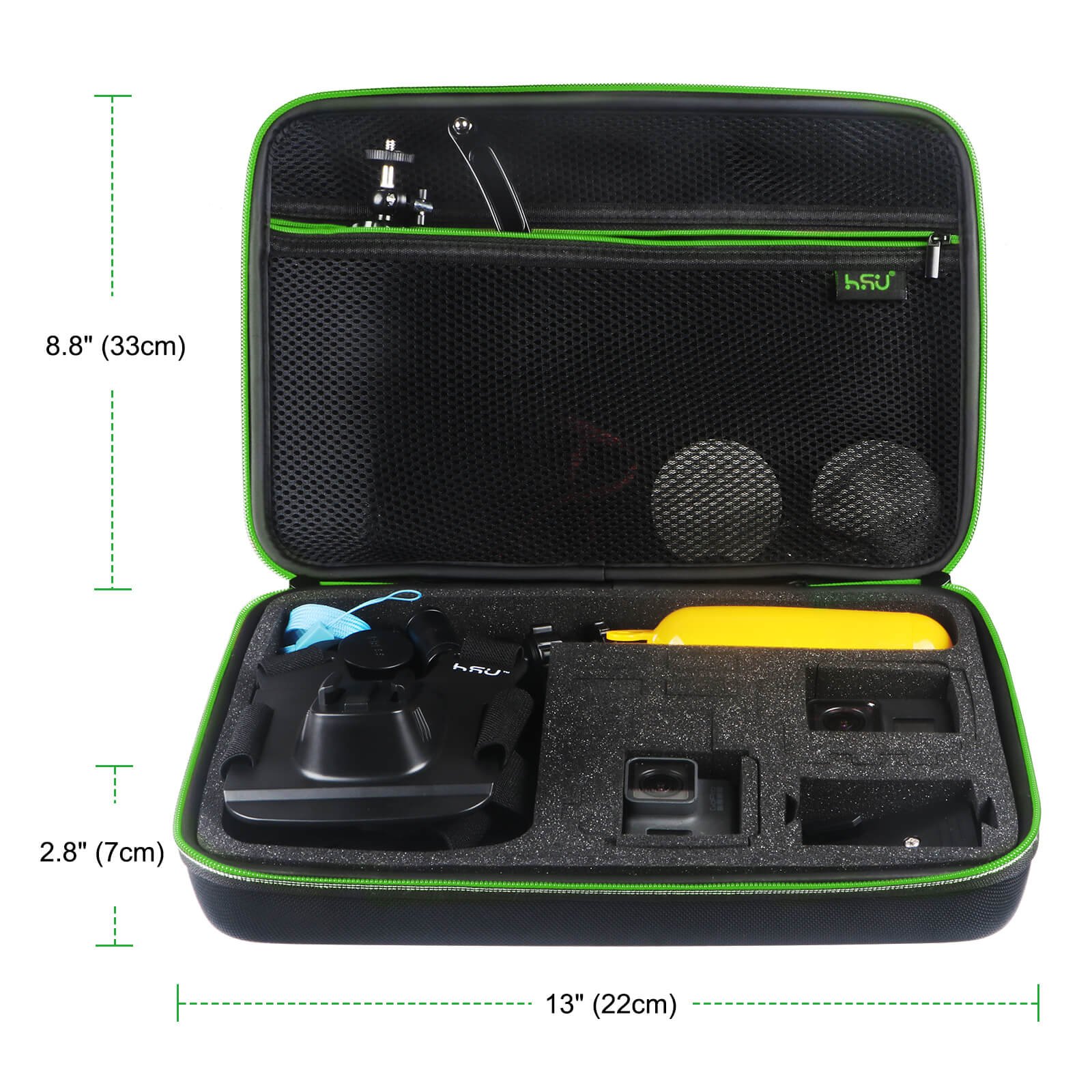 Large Carrying Case: This protective carrying case with custom cut-out foam Interior compartments to accommodate your action camera and accessories. The carrying case has a mesh pocket with a zipper to provide extra storage for cables and other accessories. With a carabiner loop for easy carrying. The loop can be easily attached to a belt or large bag.