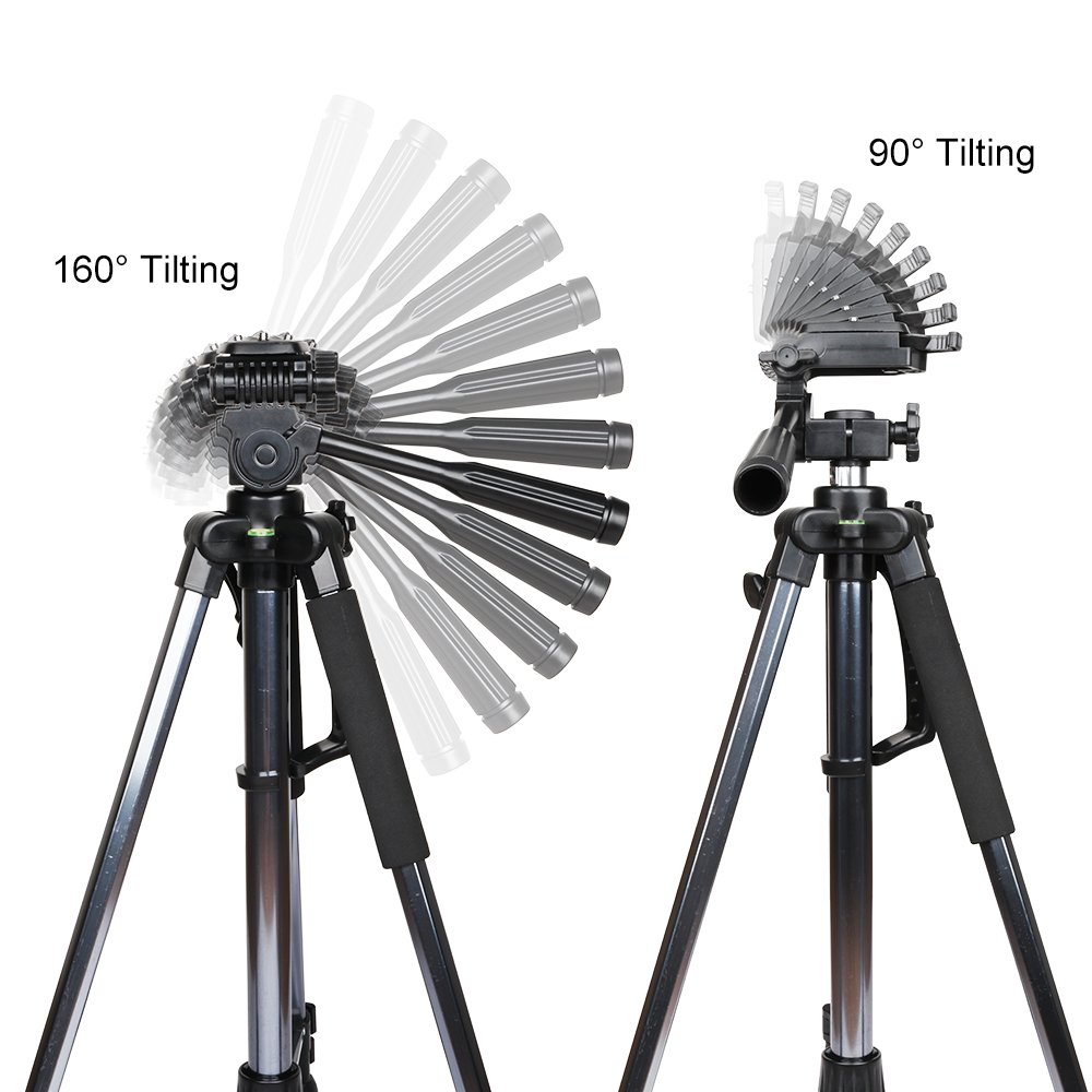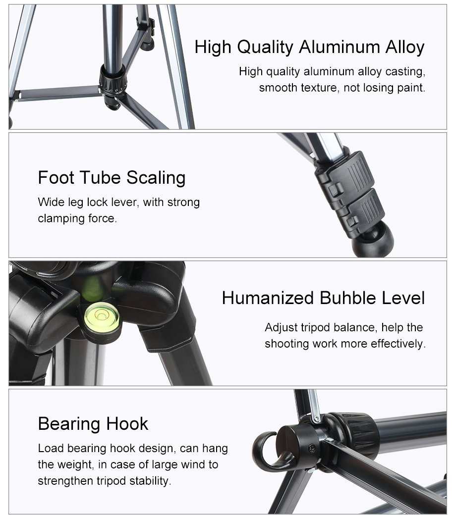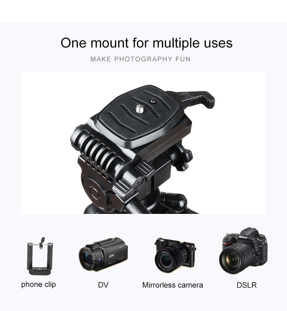- Made of high-quality aluminum. The max diameter is about 25mm which is very steady.3-Way Swivel Fluid Head with an Arca Swiss compatible clamp easy to put on and off. And can work for most cameras.